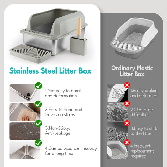 Stainless Steel Cat Litter Box with Lid, Extra Large Cat Litter Box for Multiple Cats, Easy to Clean, Non-Sticky, Anti-Leakage, All Litter Can Use, Include Litter Scoop and Mat